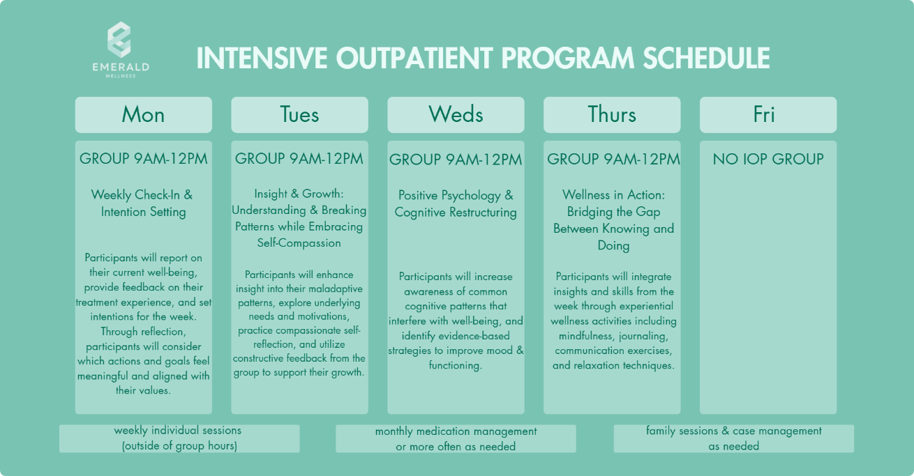 An Intensive Outpatient Program is a flexible, structured program designed for adults who need more support than traditional outpatient therapy but do not require the full-day care of Partial Care or the 24-hour structure of inpatient treatment. At Emerald Wellness, our IOP runs three to four days per week, with both daytime and evening options, making it accessible for individuals balancing work, school, or family responsibilities.